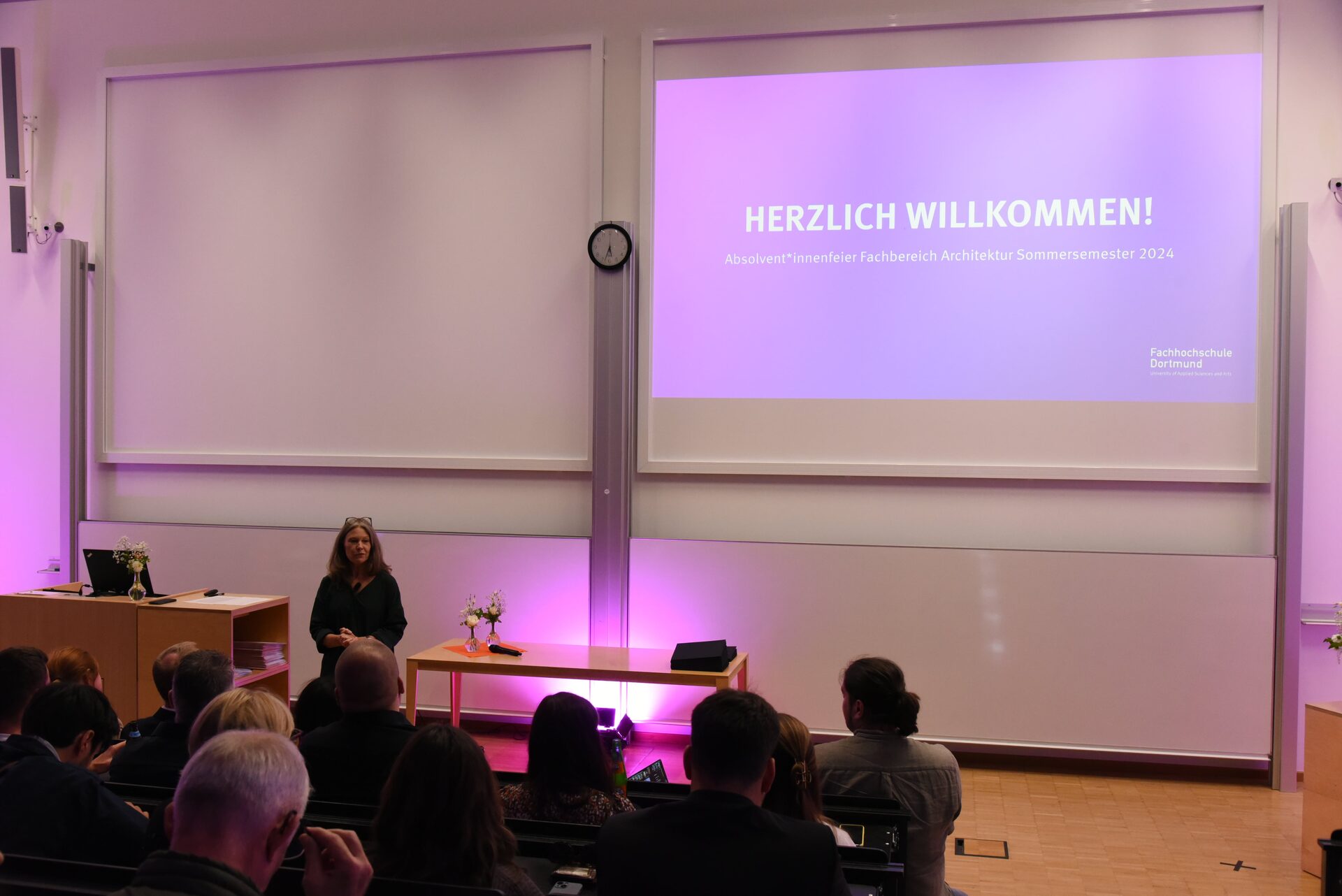 Due to the large number of guests, the ceremony was held in the Kostbar lecture hall on the Emil-Figge-Straße campus. Chancellor Svenja Stepper, patron of the faculty, opened the ceremony. In her speech, she encouraged the graduates, inspired by her personal guiding principle of lifelong learning, to always remain curious and to continue to use the creativity developed during their studies.