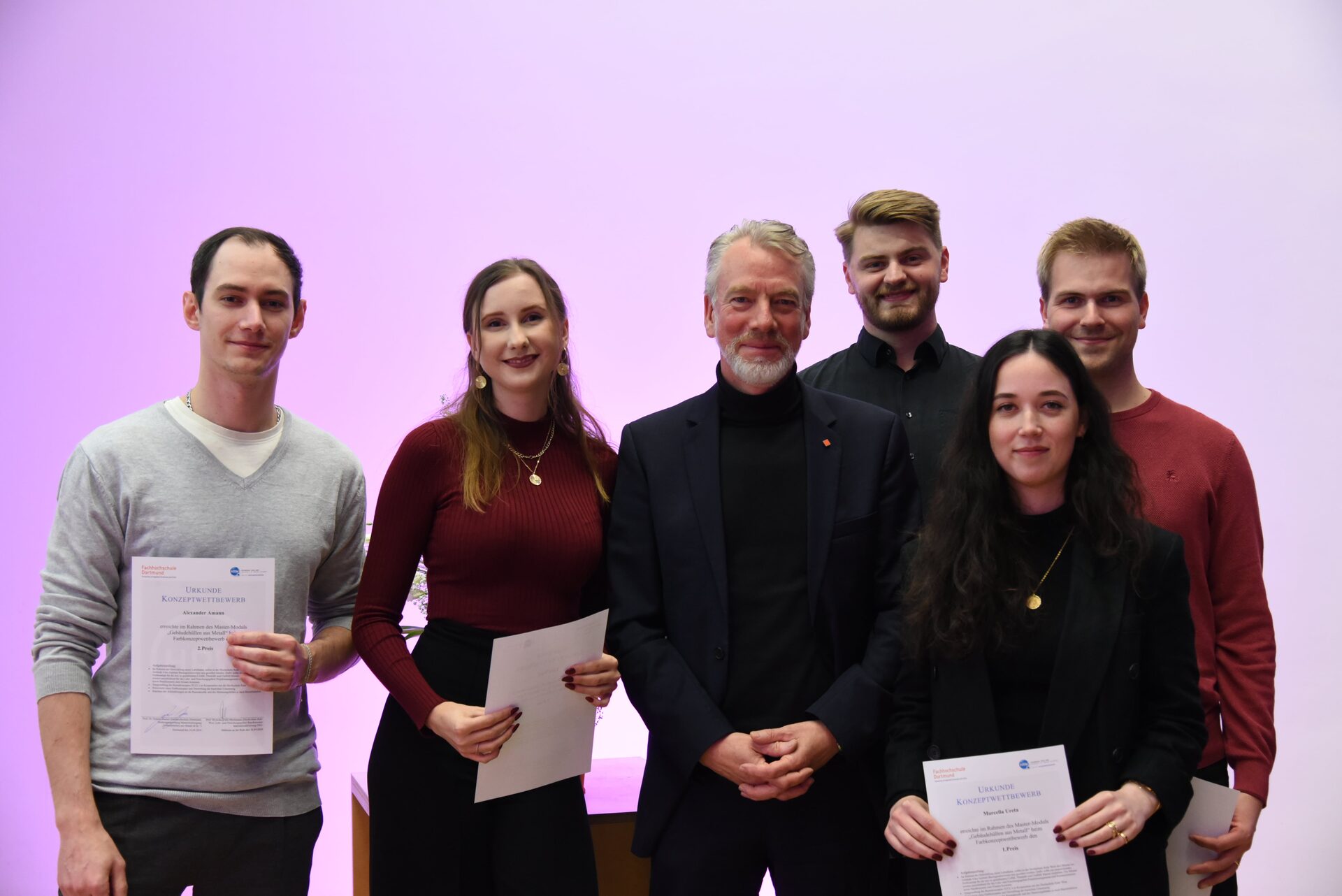 Prof. Helmut Hachul congratulated the students Alexander Amann, Jan Stöcker, Marcella Ureta, Martin Vagedes and Lena Wahl from the Master's course "Metal Building Envelopes". They also received special recognition for their design of new interiors for the laboratories at the Ruhr West University of Applied Sciences (HRW) in Mülheim.