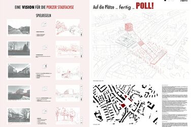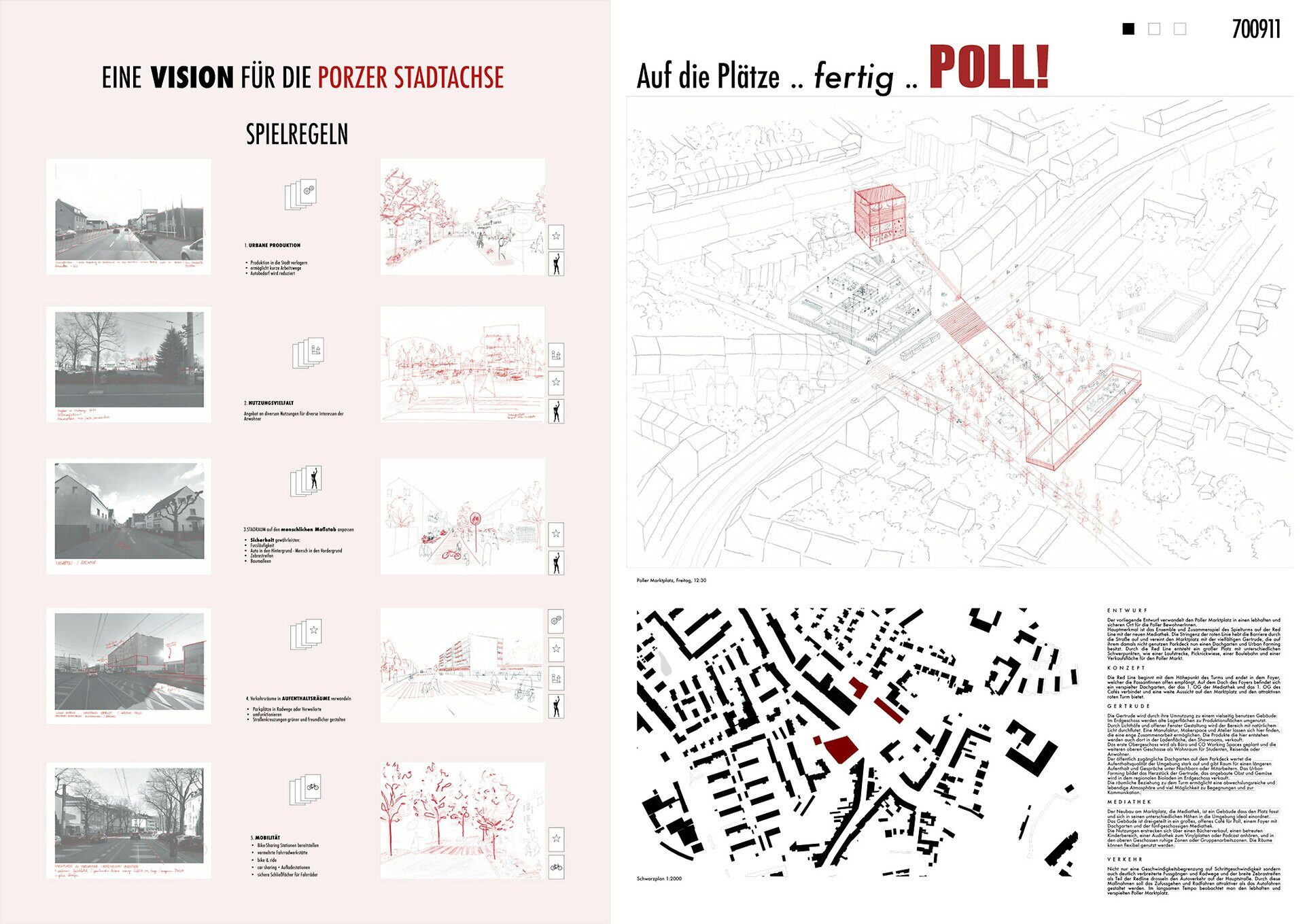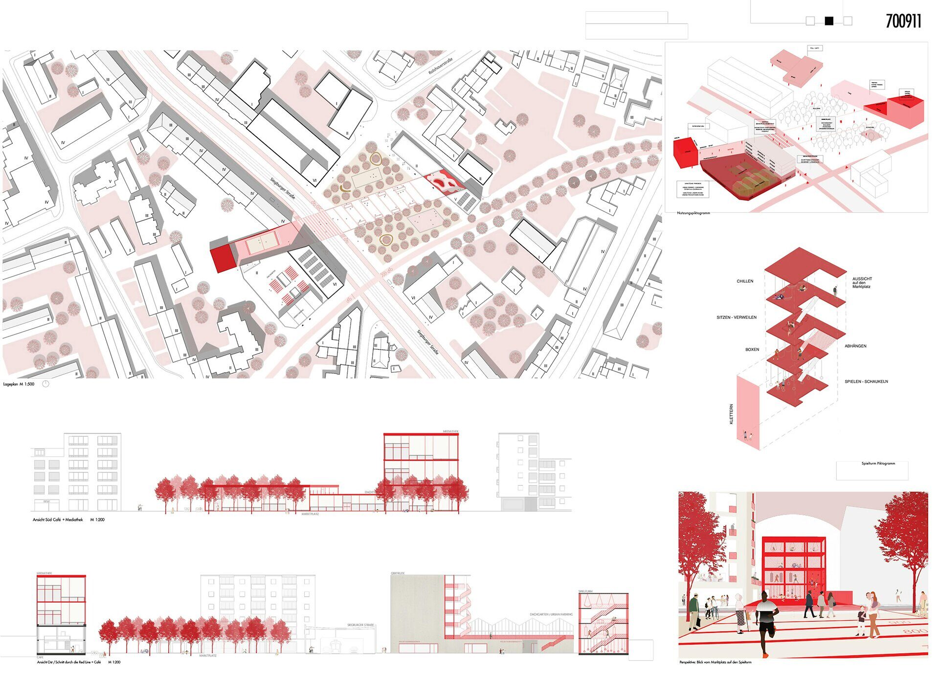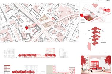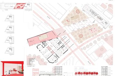 "The work begins with an unusual and at the same time very descriptive phenomenological analysis of the existing situation and initial typological sketches/theses on the rules of the game that are set for the design. The design is strongly oriented towards the existing building and develops a spatial axis as a core element. The "Red Line" is a compact market square and generous transition across Siegburger Strasse in one.