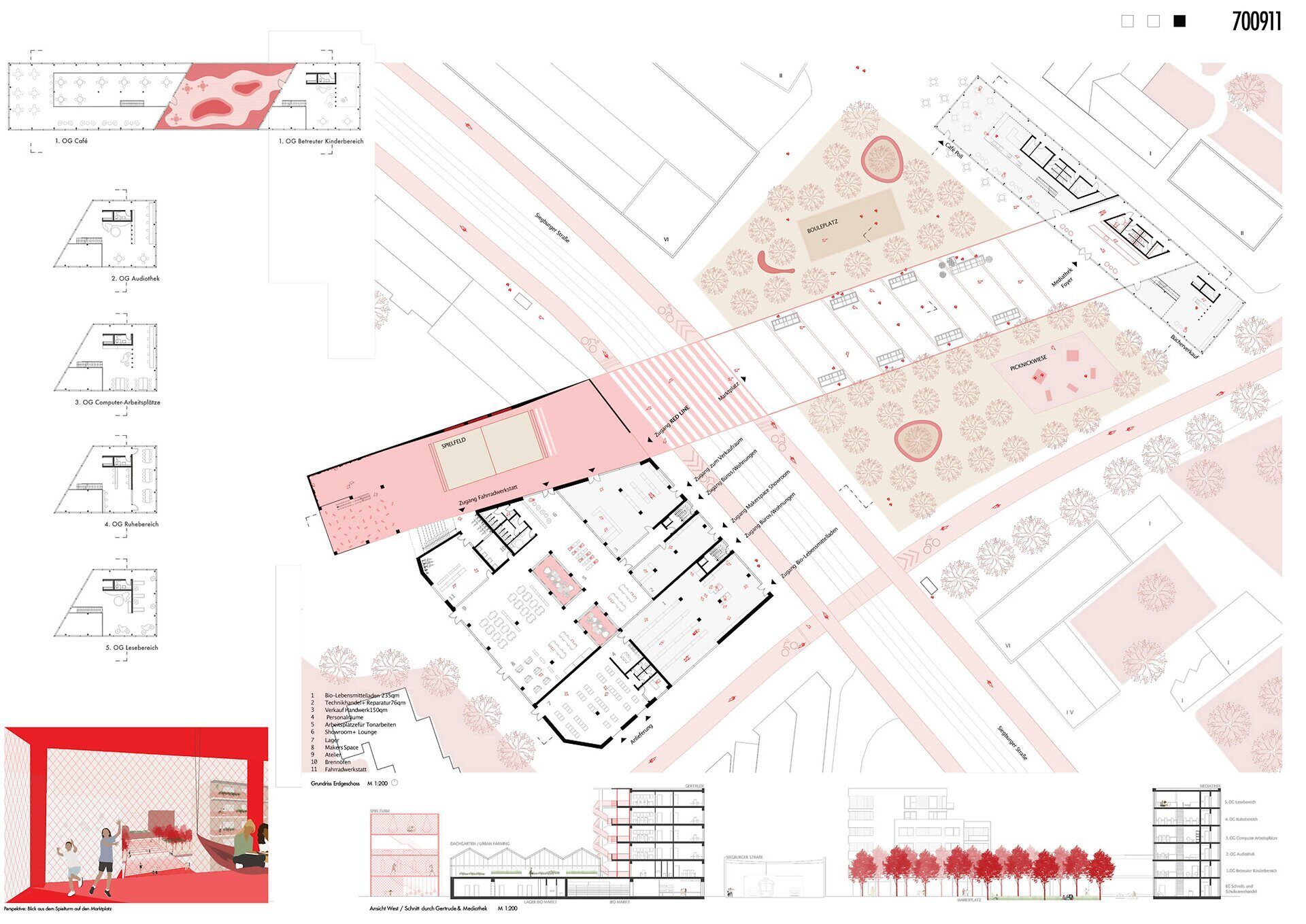 The square beyond the Red Line is densely planted with trees and supplemented with play and recreation areas. Two public buildings are positioned at the ends of the Red Line (media library and play tower). The supermarket building with the parking deck at the rear will be completely converted as "Gertrude" into a mixture of co-working, urban farming, showroom, urban production and living. The work is a stimulating contribution to the competition brief."