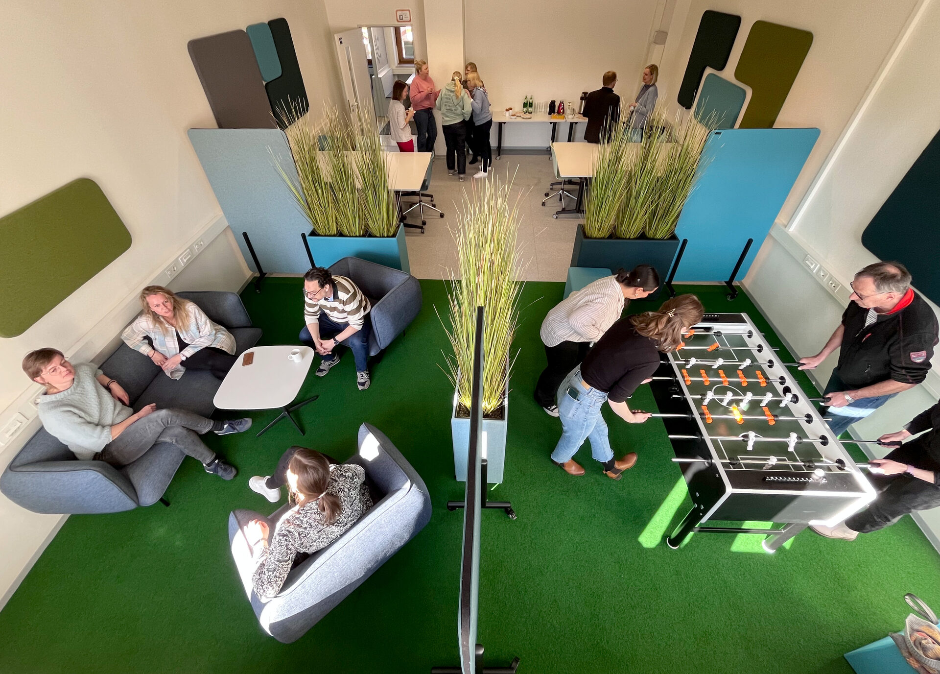 From the tall artificial plant stalks and the pretty sound absorbers in the middle of the room to the windows, there is artificial turf; to the right, a generous sofa group offers space to think, breathe and chat. On the left is the foosball table, an extra quiet model, the cork ball is available for a deposit at the service counter. There is also a DeskBike, which uses muscle power to generate electricity for charging smartphones and other devices.