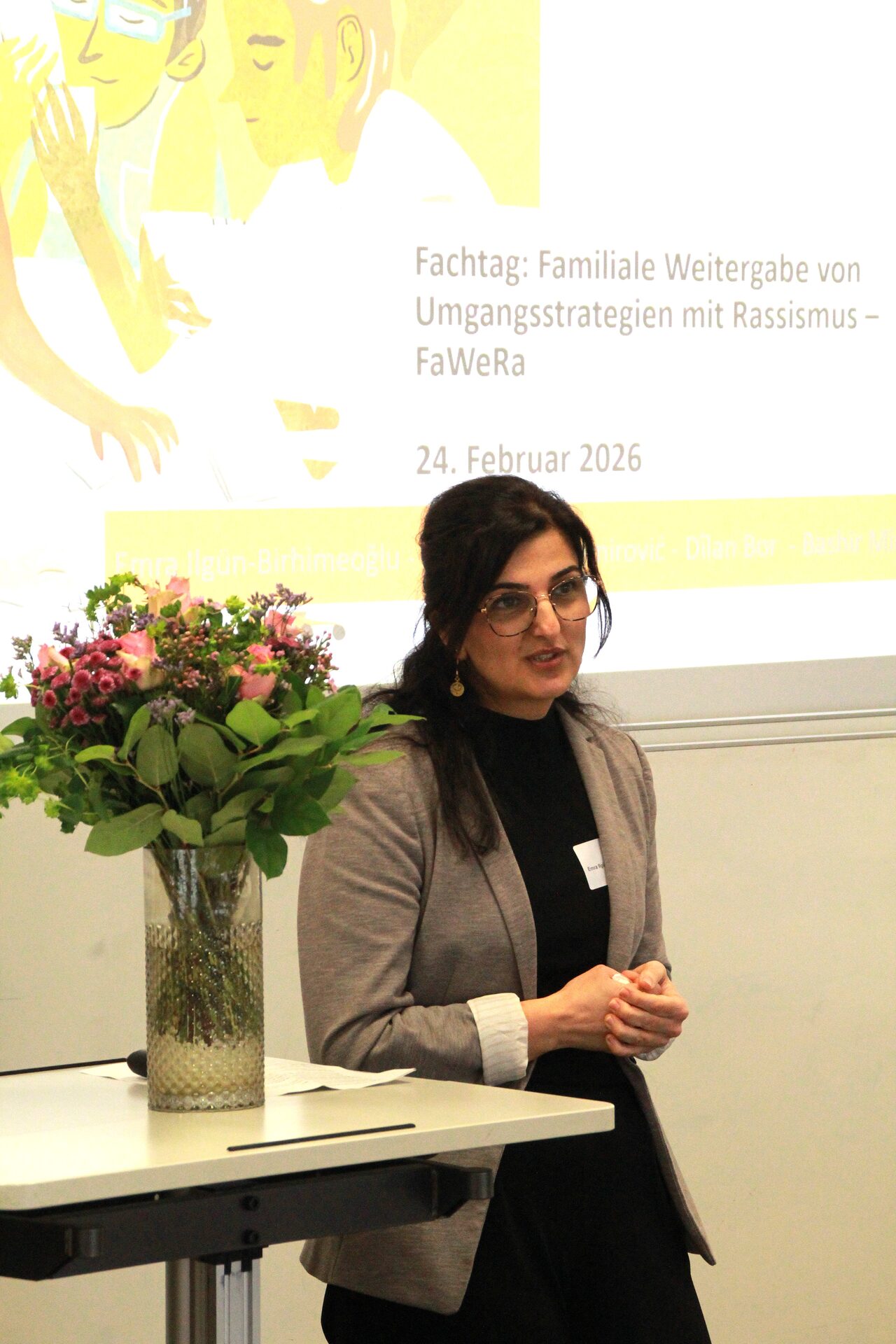 Im Mittelpunkt standen die ersten Ergebnisse des Projekts Familiale Weitergabe von Umgangsstrategien mit Rassismus (kurz: FaWeRa) unter der Leitung von Prof.in Dr.in Emra Ilgün-Birhimeoğlu (Öffnet in einem neuen Tab) , die im Plenum vorgestellt und diskutiert wurden. In den anschließenden Workshops wurden zentrale Inhalte vertieft, ausgetauscht und reflektiert. Ein besonderer Fokus lag auf der Frage, welche Bedeutung die bisherigen Erkenntnisse für die Praxis haben und welche Impulse sich daraus für die weitere Arbeit ableiten lassen.