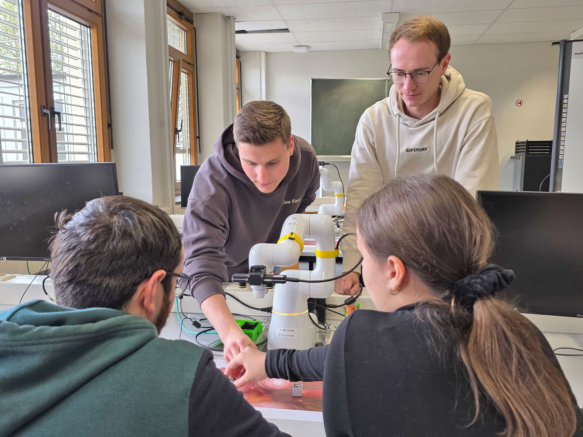 Die Zeit bis dahin sollte natürlich nicht ungenutzt bleiben: Bei einer Führung schaute Maria Studierenden über die Schulter, die gerade an Versuchsaufbauten mit medizinischen OP-Robotern arbeiteten, unterstützt von Doktorand Dominik Fromme. Die Ausstattung im „Robotic Vision Lab“ hat Prof. Dr. Jörg Thiem, spontaner Initiator des Ferien-Workshops, zum größten Teil durch Forschungsanträge akquiriert. Studierende sind in seine Forschungsprojekte eng eingebunden, denn das Leitbild der Fachhochschule ist die Einheit von Forschung und Lehre. Davon konnte sich Maria selbst überzeugen: Sie bekam Einblicke unter anderem in das Prinzip der Mustererkennung – und ergänzend zur realen Roboterwelt tauchte sie mit einer speziellen VR-Brille in virtuelle Welten ein.