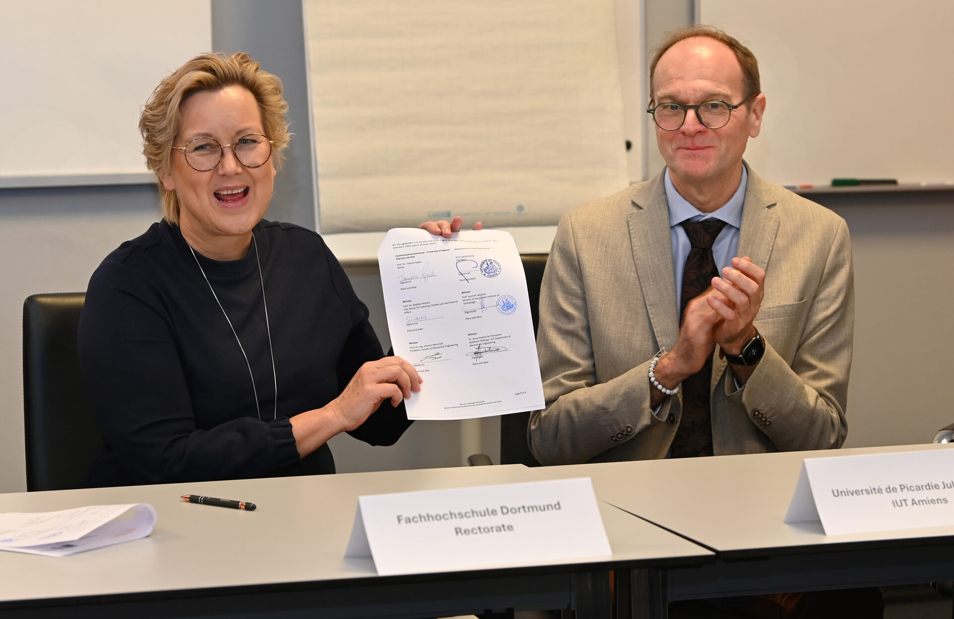 Neben den Austauschprogrammen sollen künftig auch Doppelabschlüsse beider Hochschulen möglich werden. „Der Erfolg unserer Zusammenarbeit wird sich aber nicht nur an der Zahl der Doppelabschlüsse messen lassen, sondern vielmehr an der Zahl der Studierenden, Lehrenden und Verwaltungsmitarbeiter*innen, die die Gelegenheit hatten, die jeweils andere Hochschule und die Partnerstadt kurz oder ausführlich kennenzulernen“, betonten die Koordinator*innen Ass.-Prof. Anne-Sophie De Franceschi (UPJV) und Prof. Dr. Vincent Marciniak (FH Dortmund).