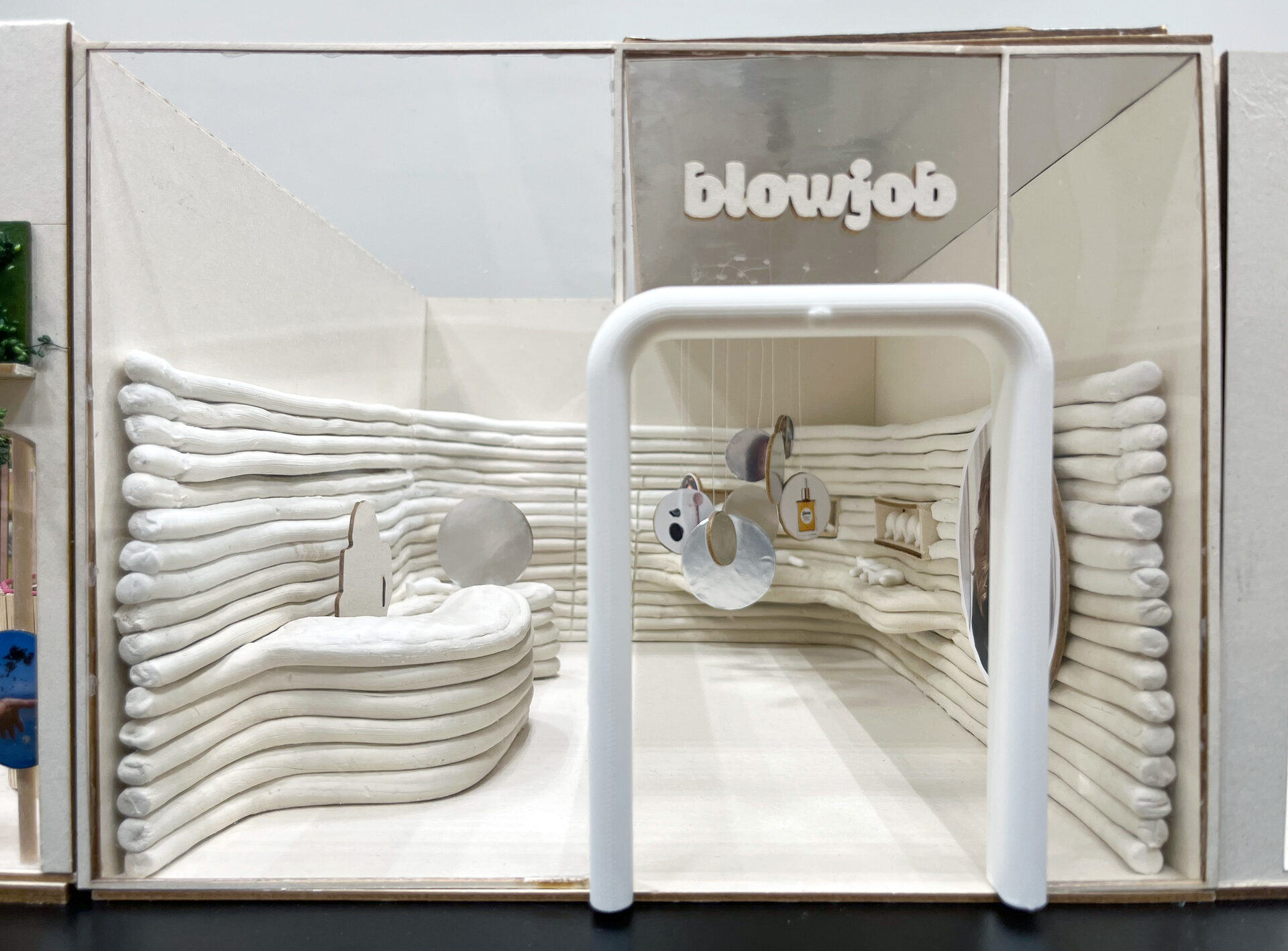 Students on the Object and Spatial Design study program each designed and constructed a miniature model of a store. The design included the product idea, the business concept for its marketing and the implementation in the model. All the models were on display side by side at the podium show - as if you were wandering through a fictitious, stylish shopping street.