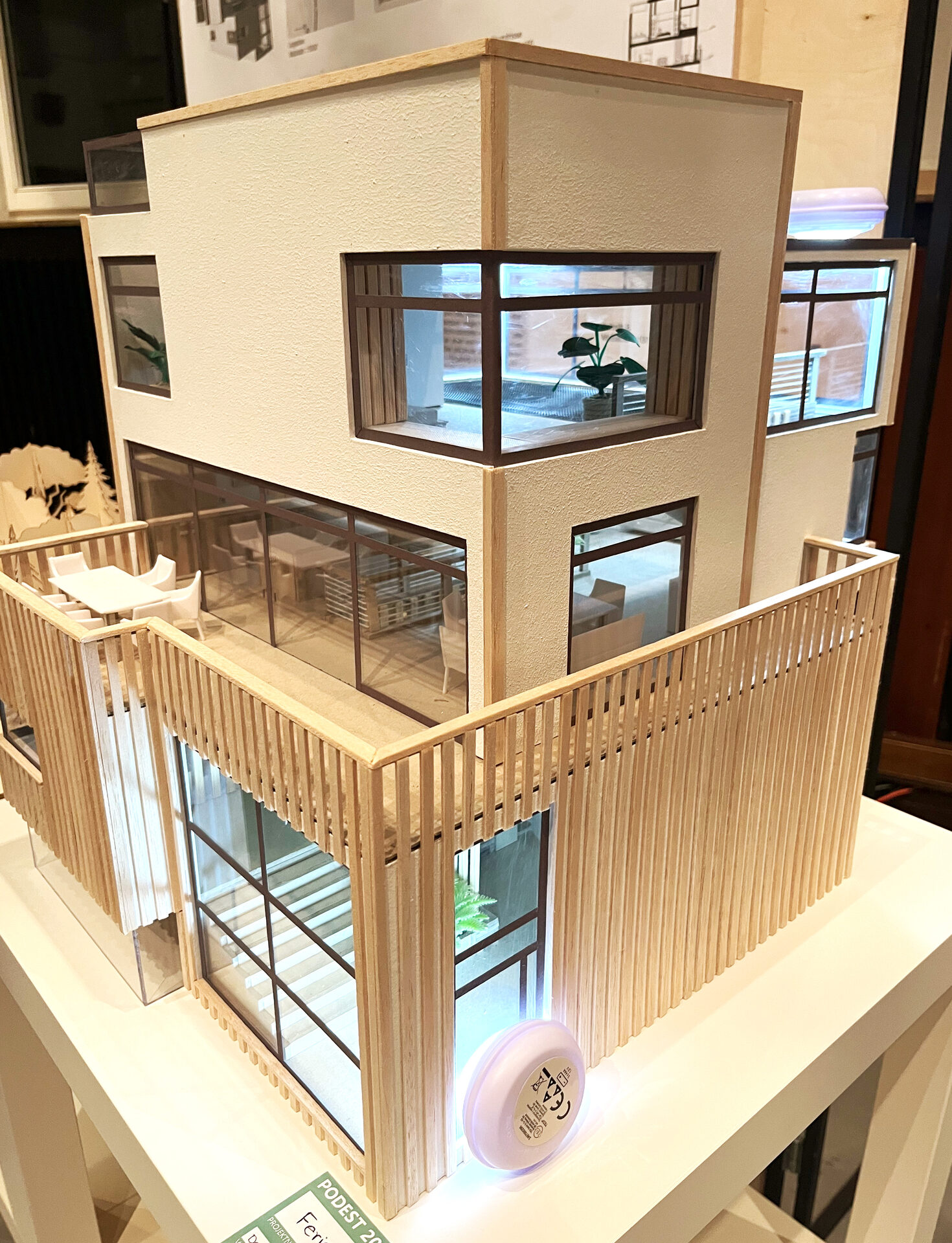Dana Neumann calls her design for a luxurious vacation home "Ferienhaus Waldblick". In the faculty's assembly hall, it was housed in the middle of a mini-forest, which she had also constructed herself, and evoked a sense of peace and relaxation, in a row with imaginative constructions by other students.