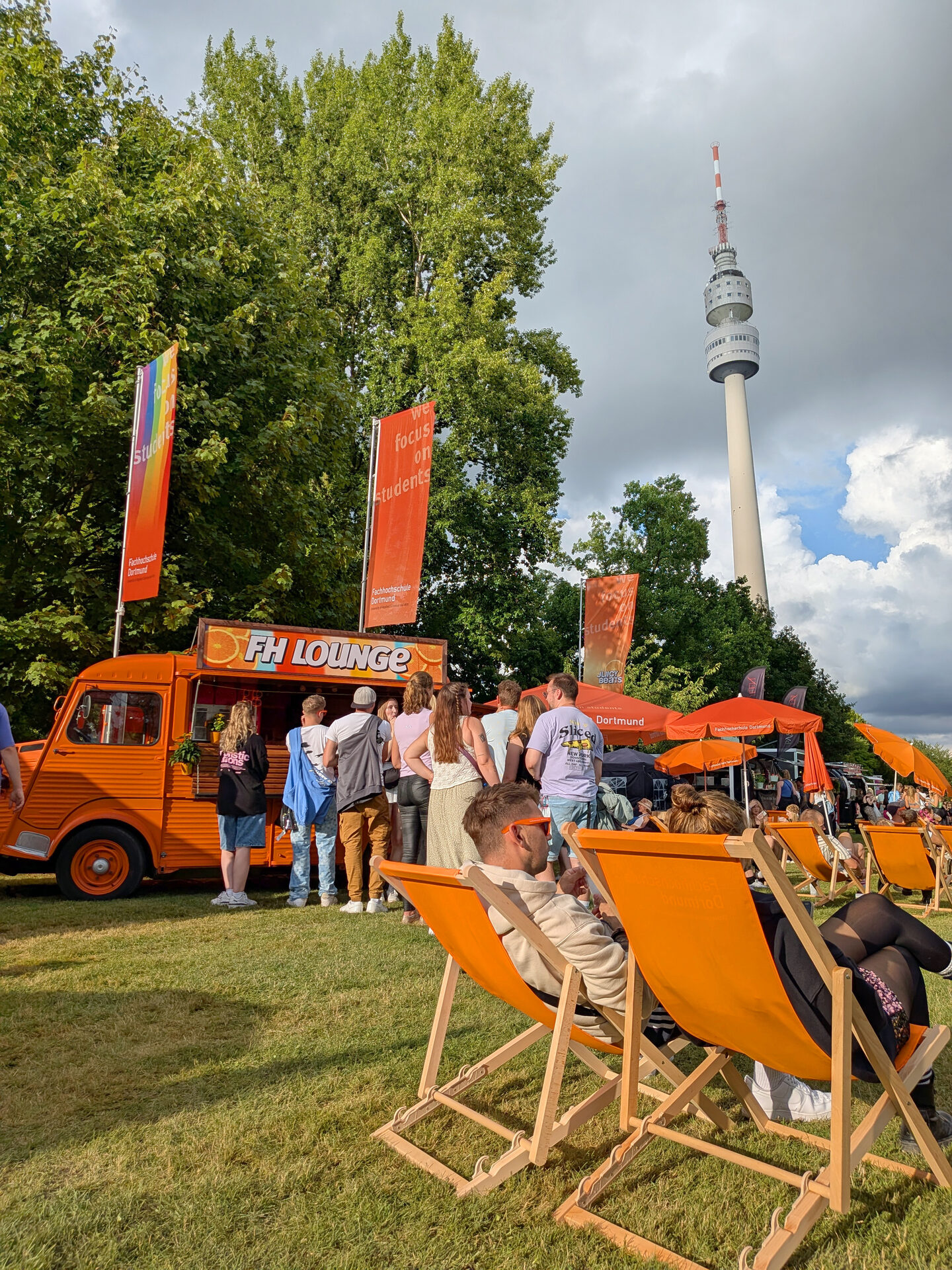 A relaxed lounge atmosphere awaited those who entered the FH Village under the waving flags with the inscription "We focus on students". With a view of the second main stage, the FH invited you to take a deep breath and enjoy. The orange deckchairs and stools were much sought after to give your dancing feet a little rest. The large awning and orange parasols provided shade and protection from the brief showers that swept across the grounds. At the FH vintage car, the orange Citroën HY, the slush ice machine ran hot to refresh the guests.
