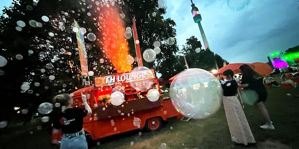 The Citroën HY as the anchor point of the FH Village was more than just a refreshment station with slush and water ice: it quickly became a meeting point for new acquaintances, short conversations and spontaneous selfies - for example with the FH stick-on tattoos. And when the new bubble and fog machine on the roof of the vintage car started up, there was hardly a cell phone camera left in the bag. In the evening, lights and spotlights bathed the area in warm orange, while the beats of the festival echoed across the grounds. People danced and partied around the FH Lounge at the Silent Disco until late into the night.