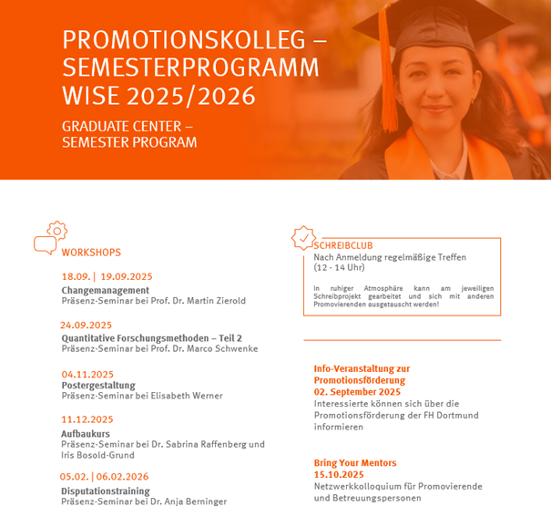 We will not leave you alone when applying for doctoral funding. On September 2, 2025 from 10-11 a.m. we offer a consultation hour to prepare the application documents. You can register for this by sending an email to promotionskollegfh-dortmundde If you miss the session or still have questions, please contact us for individual counseling.