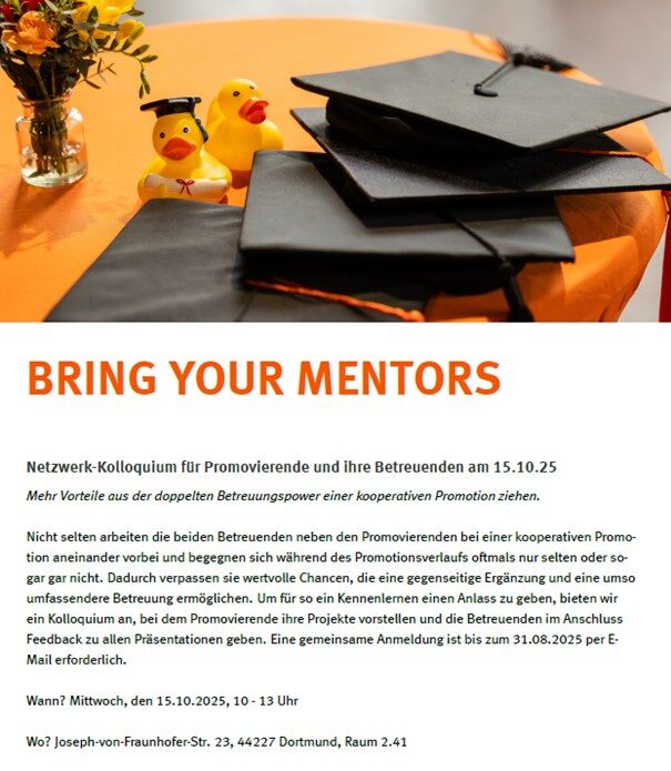 Our new event "Bring Your Mentors" will take place for the first time on Wednesday, October 15, 2025, from 10 am to 1 pm in room 2.41 at Joseph-von-Fraunhofer-Str. 23, 44227 Dortmund.