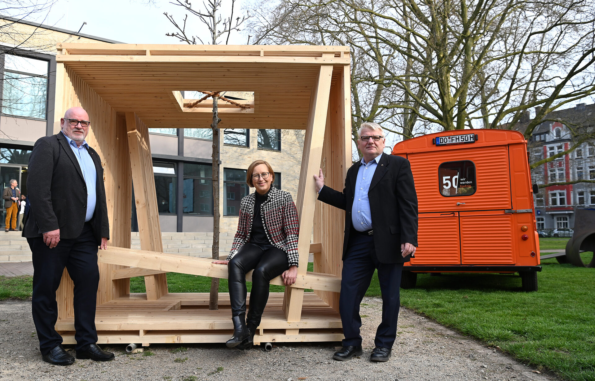 Die Fachhochschule Dortmund feierte von August 2021 bis Juli 2022 ihren 50. Geburtstag. Dieses besondere Jubiläum wurde durch eine Vielzahl an Veranstaltungen, Maßnahmen und Feierlichkeiten ausgiebig gewürdigt. Bei der Aktion „Jubiläums-WürFHel“ wurden großformatige HolzsitzwürFHel an verschiedenen Standorten in der Stadt aufgestellt. Die WürFHel wurden unter Mitwirkung von Studierenden des Fachbereichs Architektur erstellt. Sie bewirkten eine hohe Sichtbarkeit der Hochschule im Jubiläumsjahr und sind auch danach weiterhin für die Öffentlichkeit nutzbar. Die Aktion wurde gemeinsam mit den langjährigen Partnern*innen Wilo Foundation, Sparkasse Dortmund, Stadt Dortmund/ Grünflächenamt und der Rudolf-Chaudoire-Stiftung realisiert, welche das Projekt finanziell sowie durch die Vermittlung von Standorten unterstützt haben.