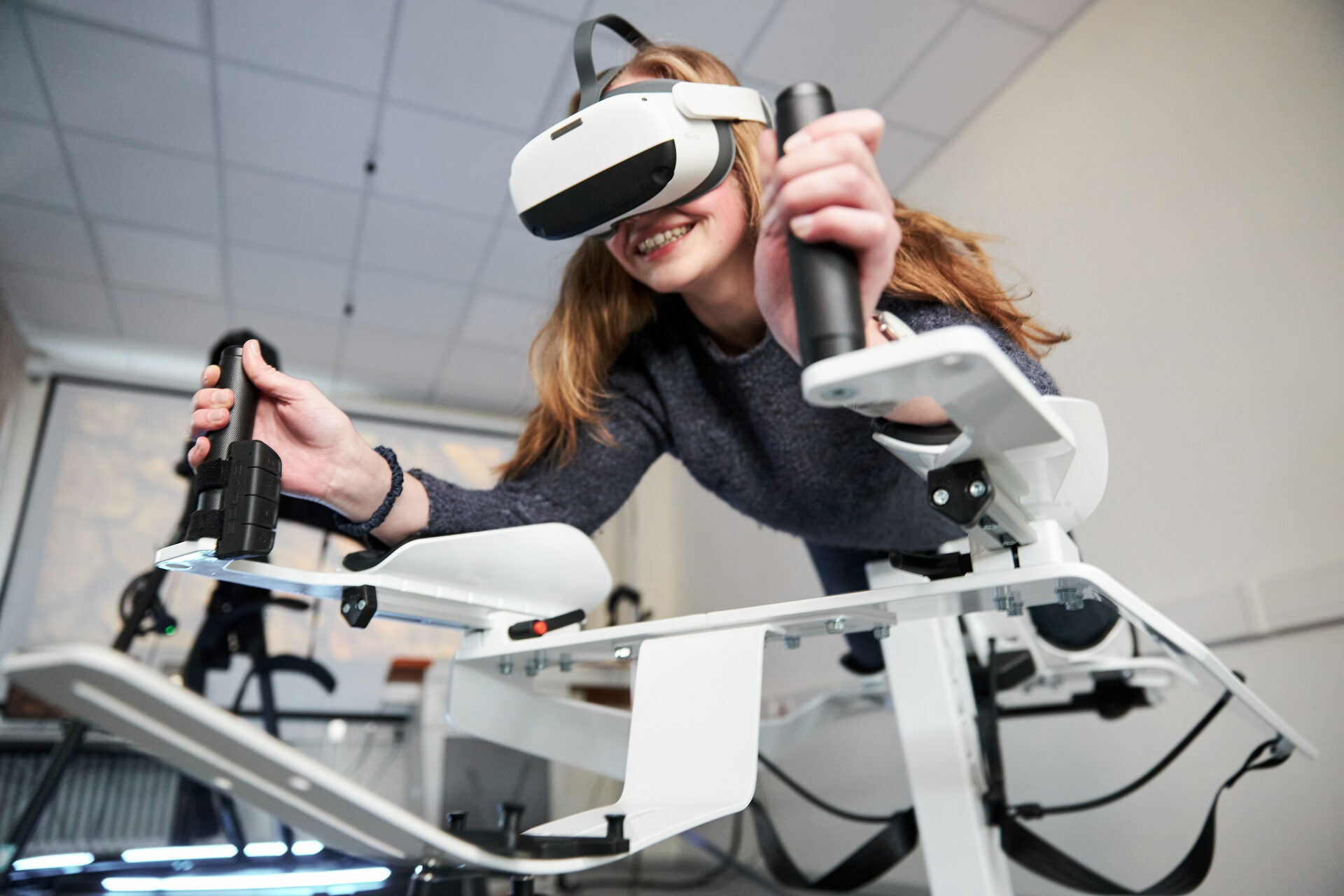 In dem Labor befinden sich links zur Fensterseite drei Tischreihen mit Computerarbeitsplätzen und rechts davon eine Ganganalyse sowie ein Fahrrad und ein kleiner Stepper. Hinter Ihnen befindet sich noch ein Ergometer sowie ein Laufband. Vor sich sehen Sie einen Teil des Raumes, den man mit Vorhängen abtrennen kann, dort befindet sich der XR-Bereich mit einem Icarus und weiteren XR-Technologien sowie ein Schreibtisch und eine Leinwand.
